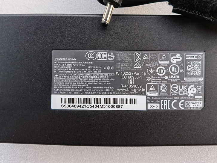 Adattatore MSI A20-240P2A 100-240V? 50-60Hz (for worldwide use) 20V 12A 240W